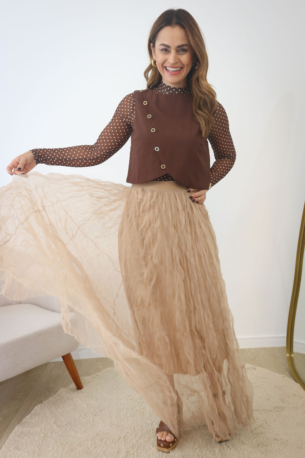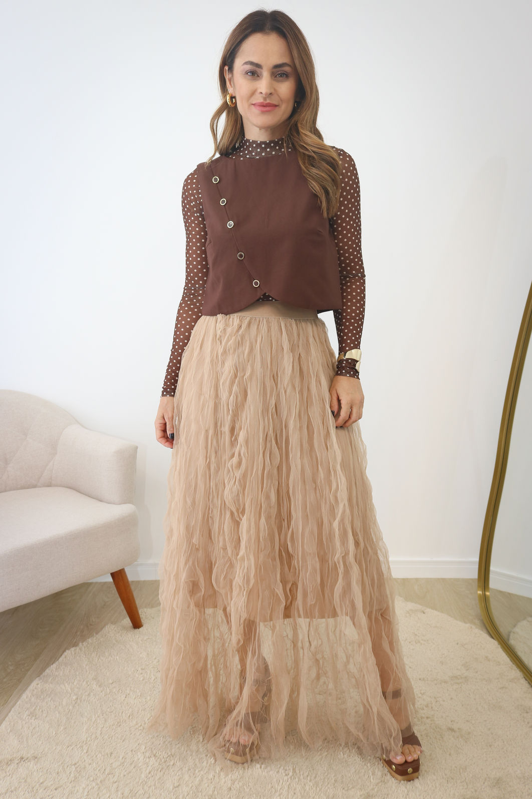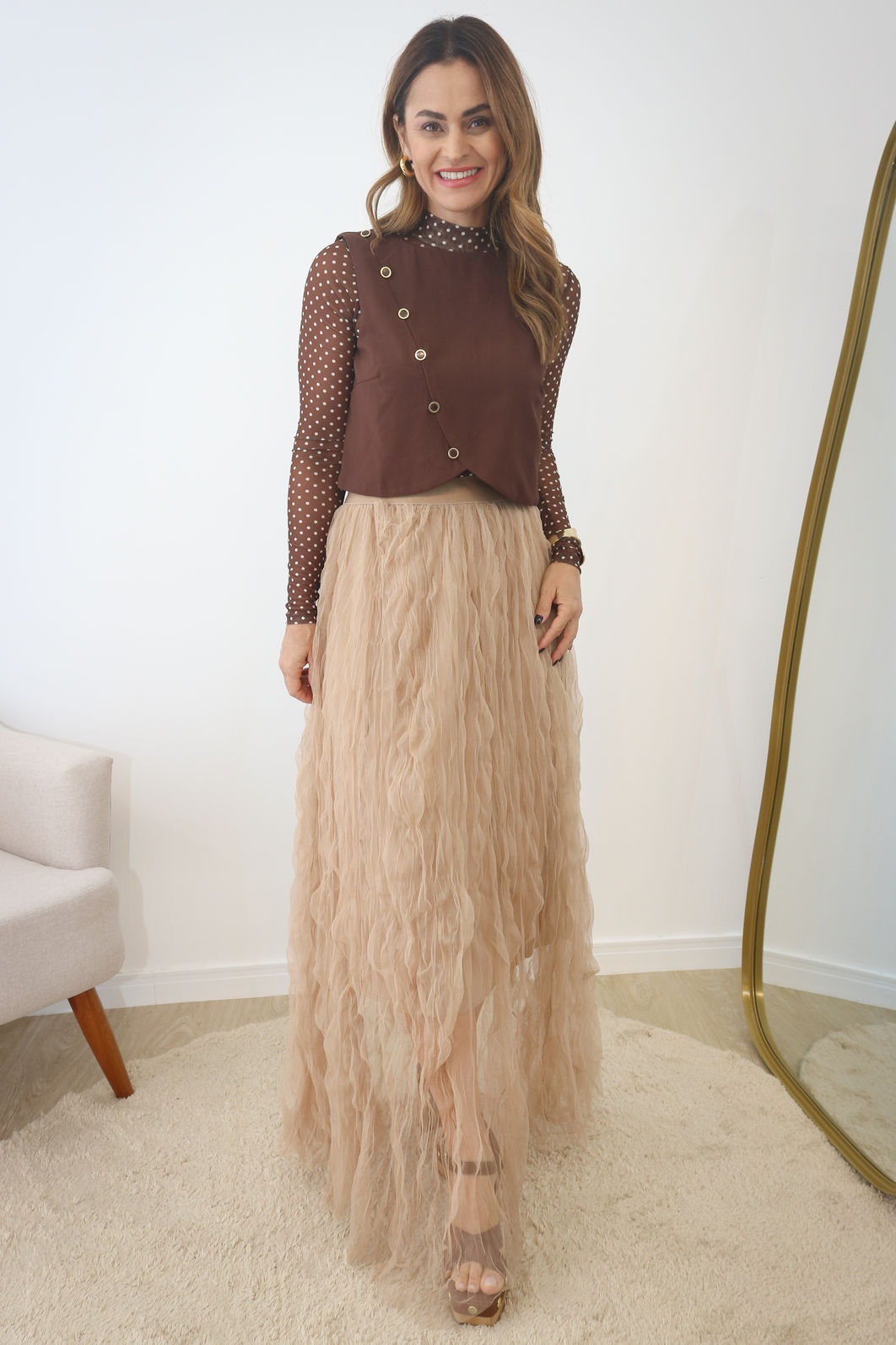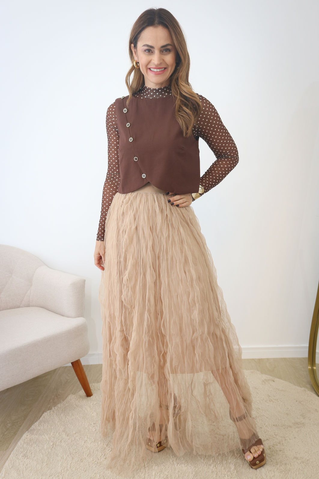 Blusa de Tule Cor Poá Marrom – A Peça Trend que Transforma Qualquer Look