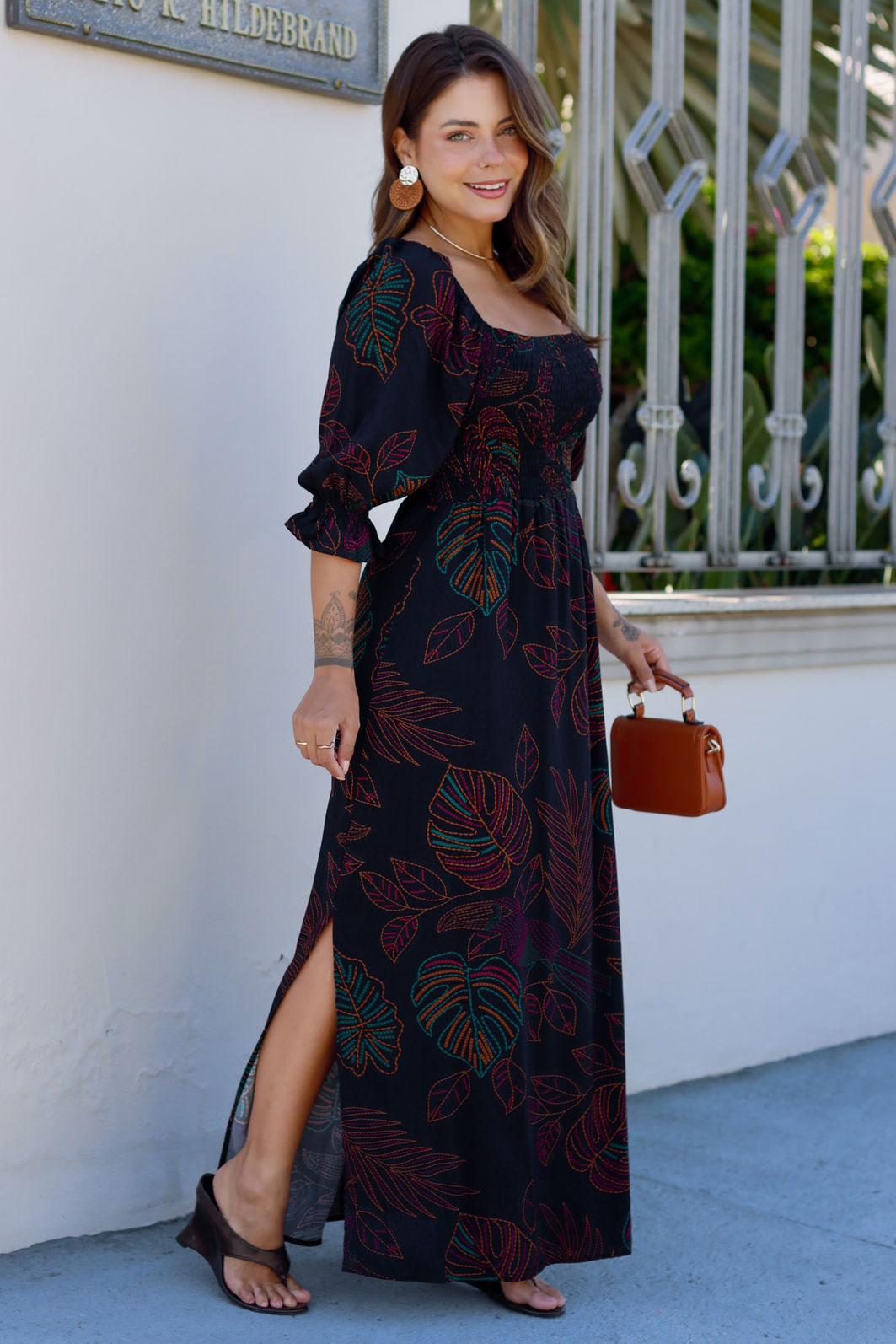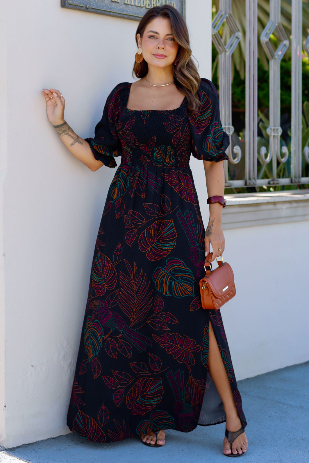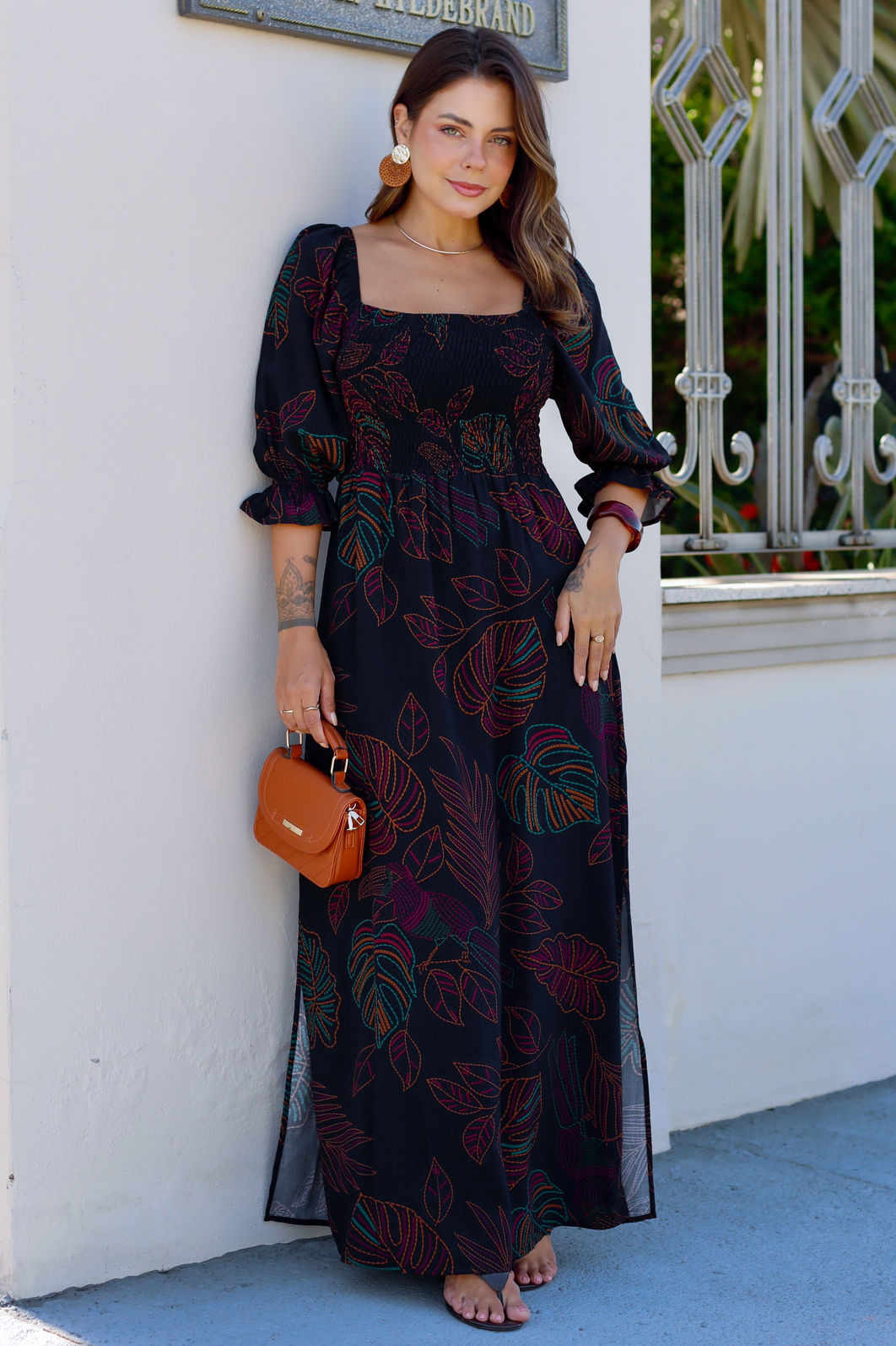 Vestido Ana Júlia Longo - Estampa Folhas Fundo Preto