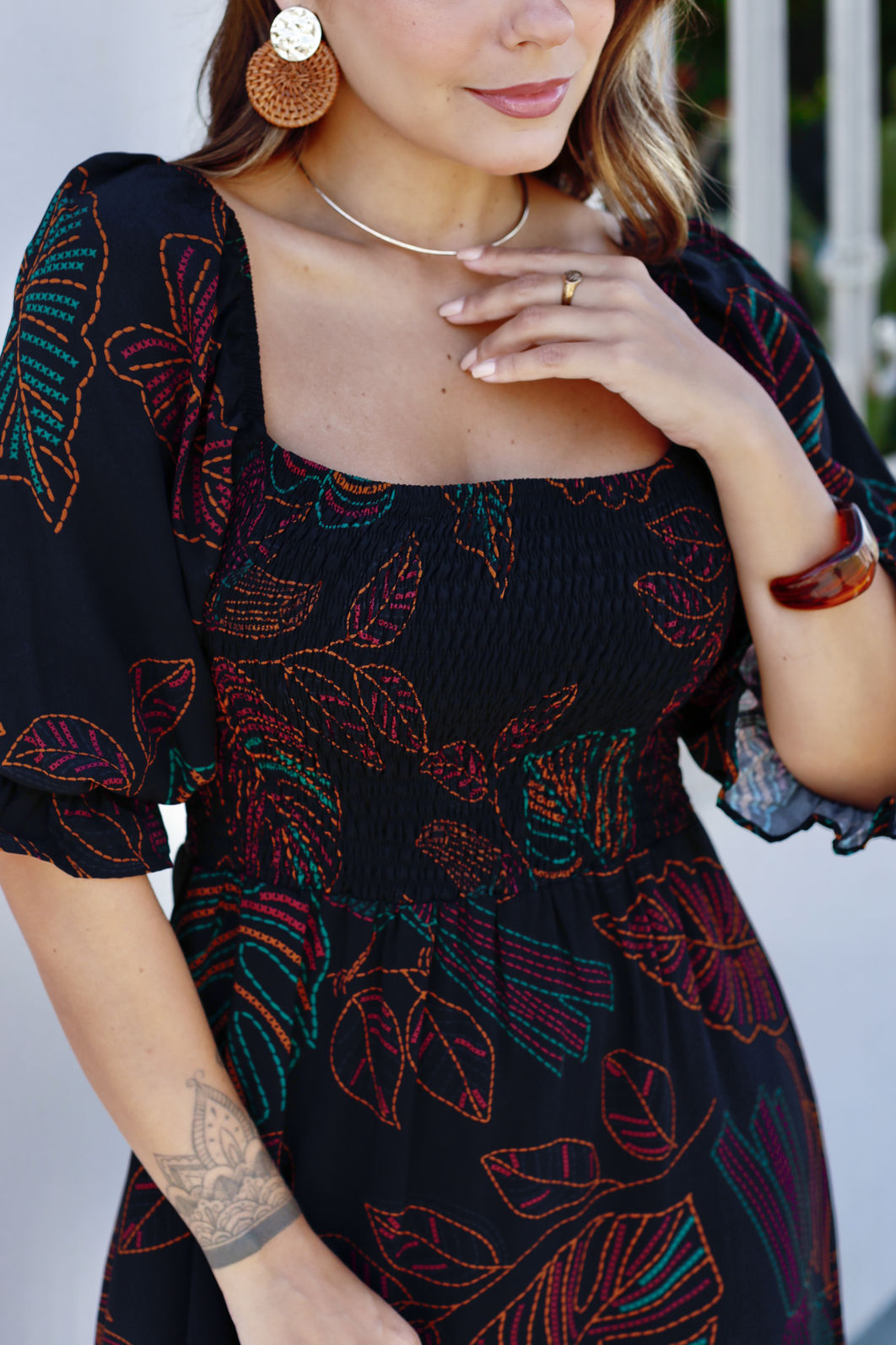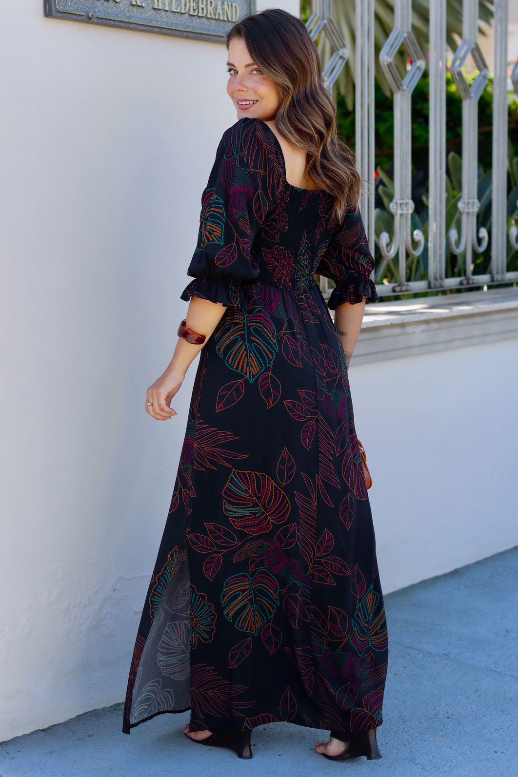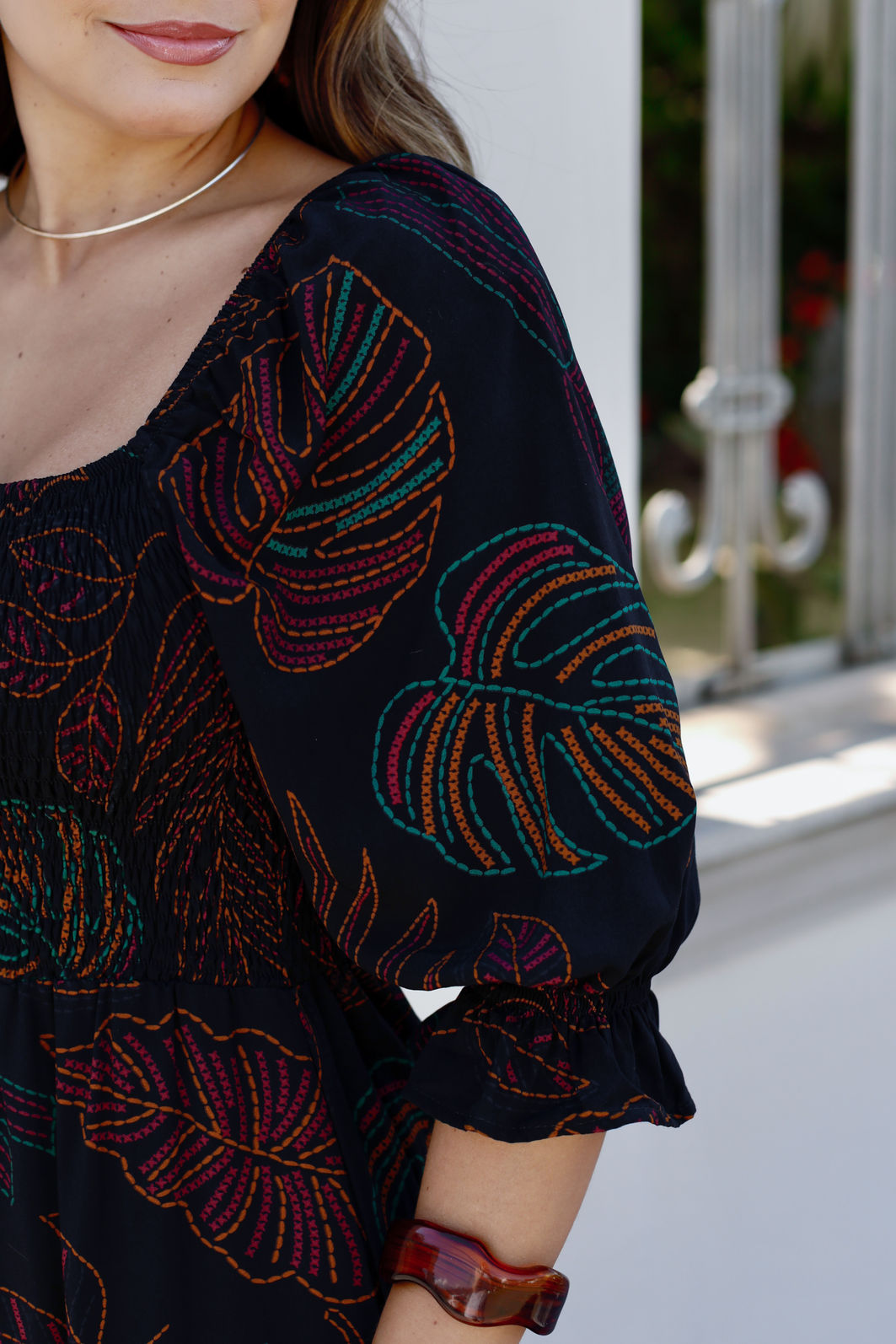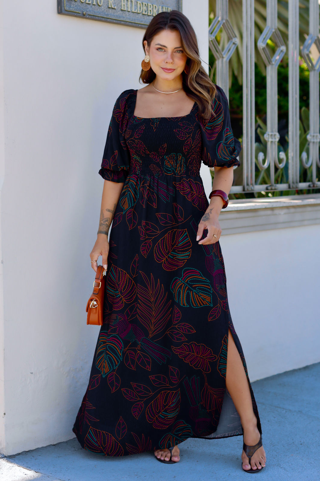 Vestido Ana Júlia Longo - Estampa Folhas Fundo Preto