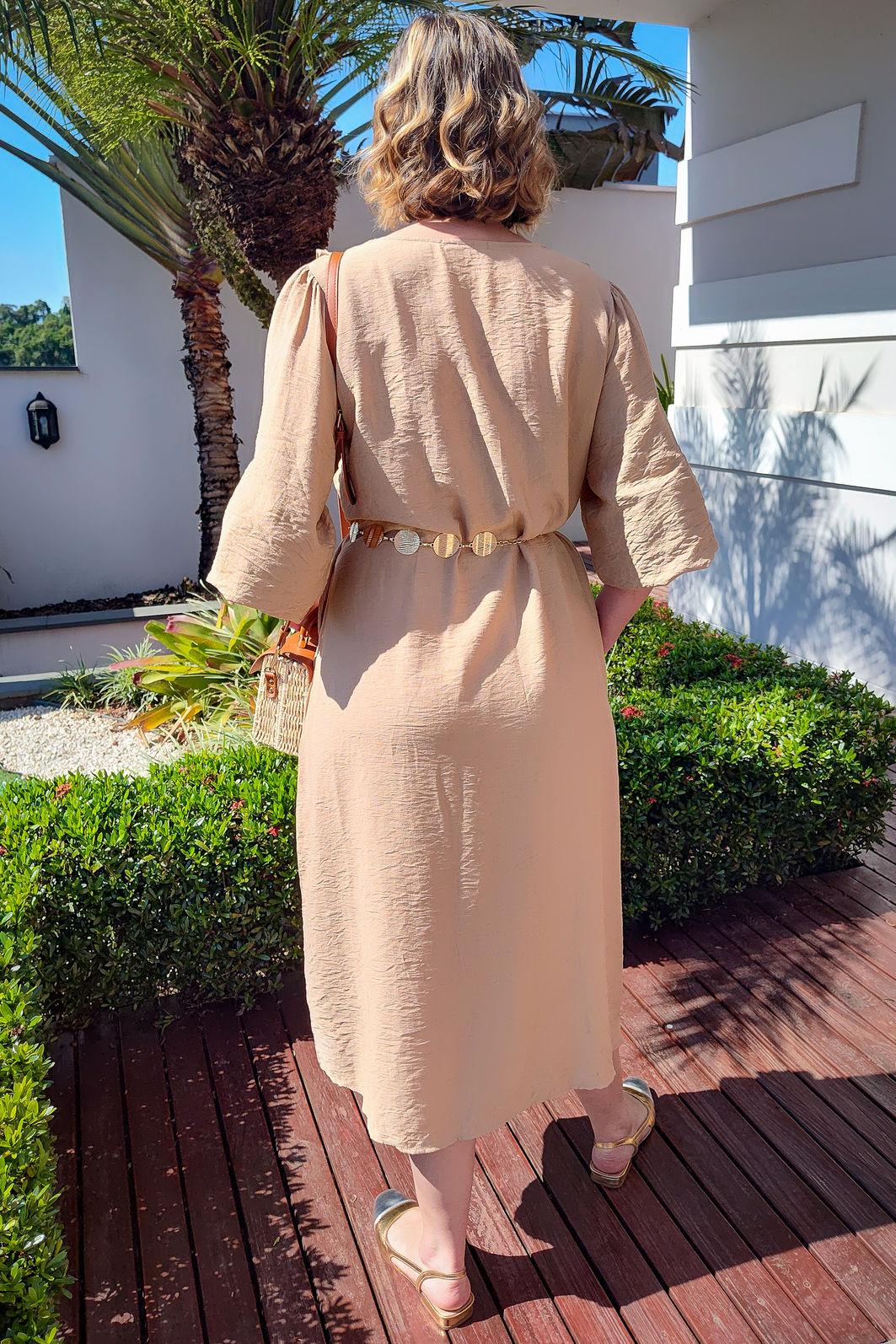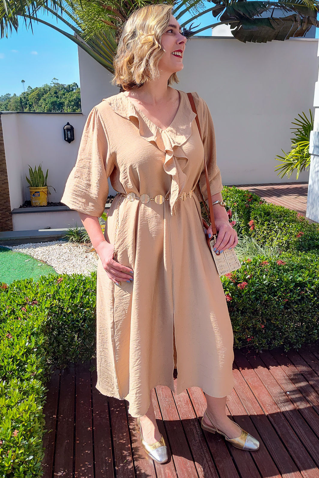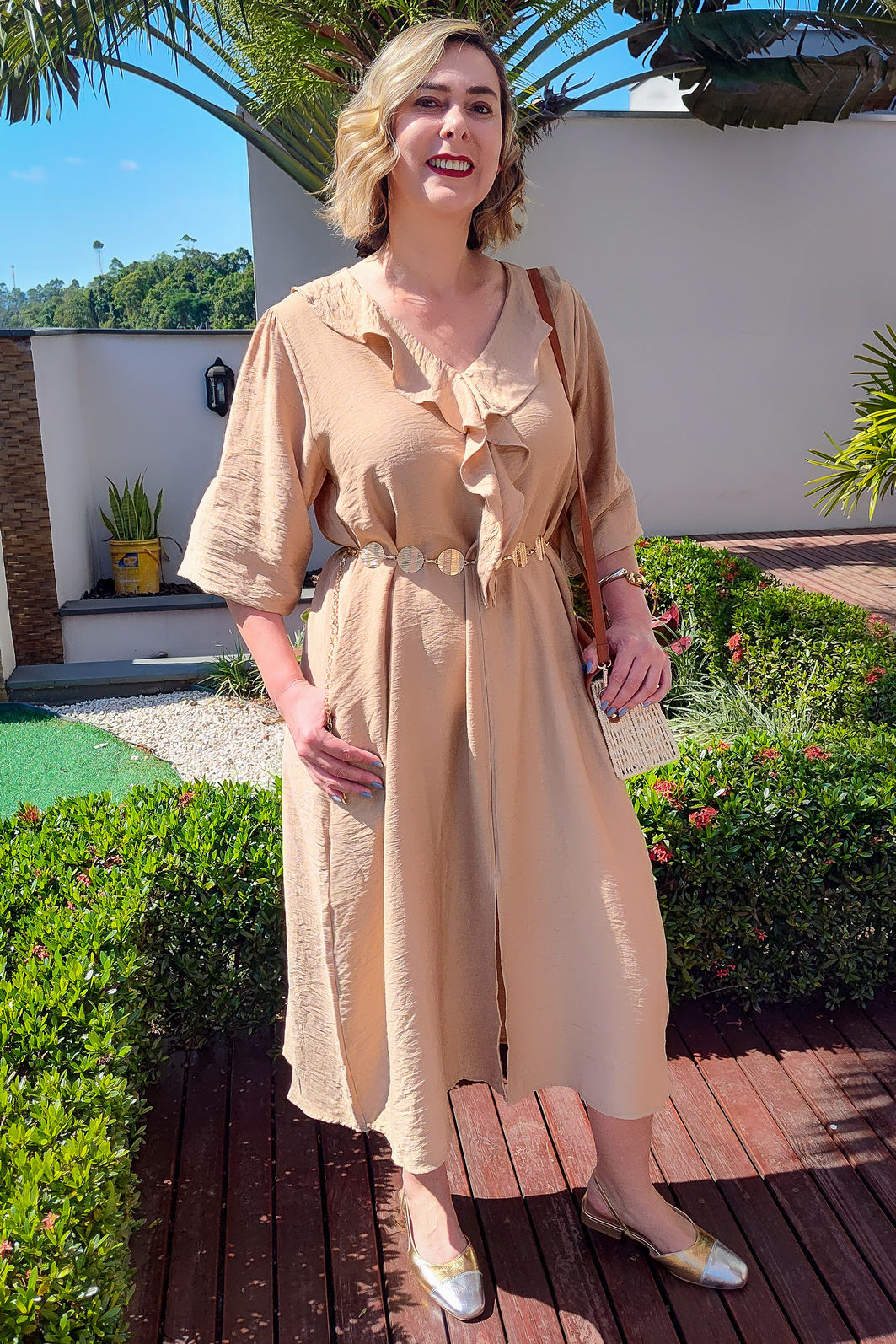Sua modelagem solta e fluida proporciona conforto ao longo do dia, enquanto o comprimento midi e o babado com movimento adicionam um toque de feminilidade e graça ao look.