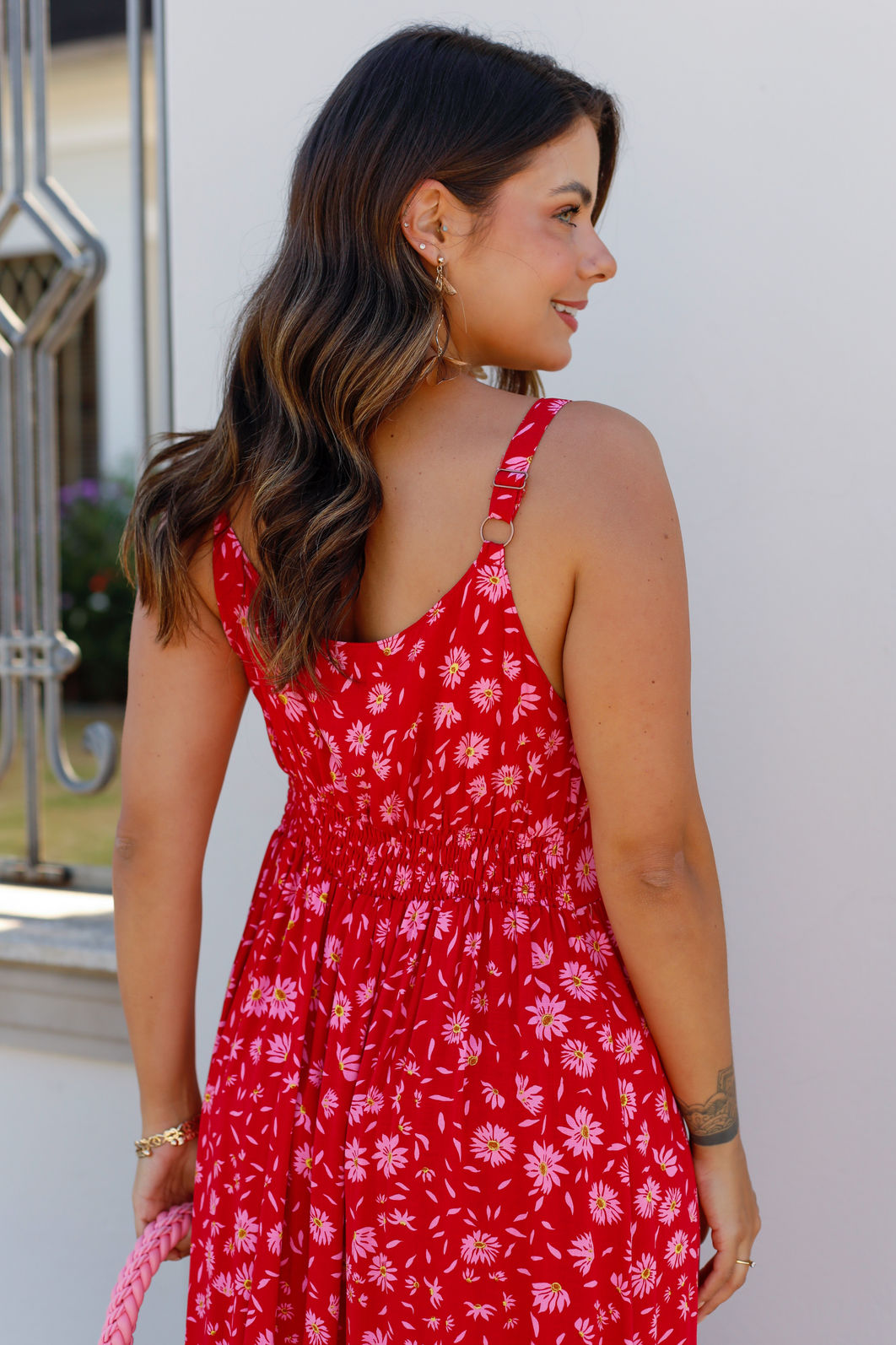 AdicionarVestido Cris em Tecido Plano de Viscose - Alças Reguláveis - Estampa Margaridas.