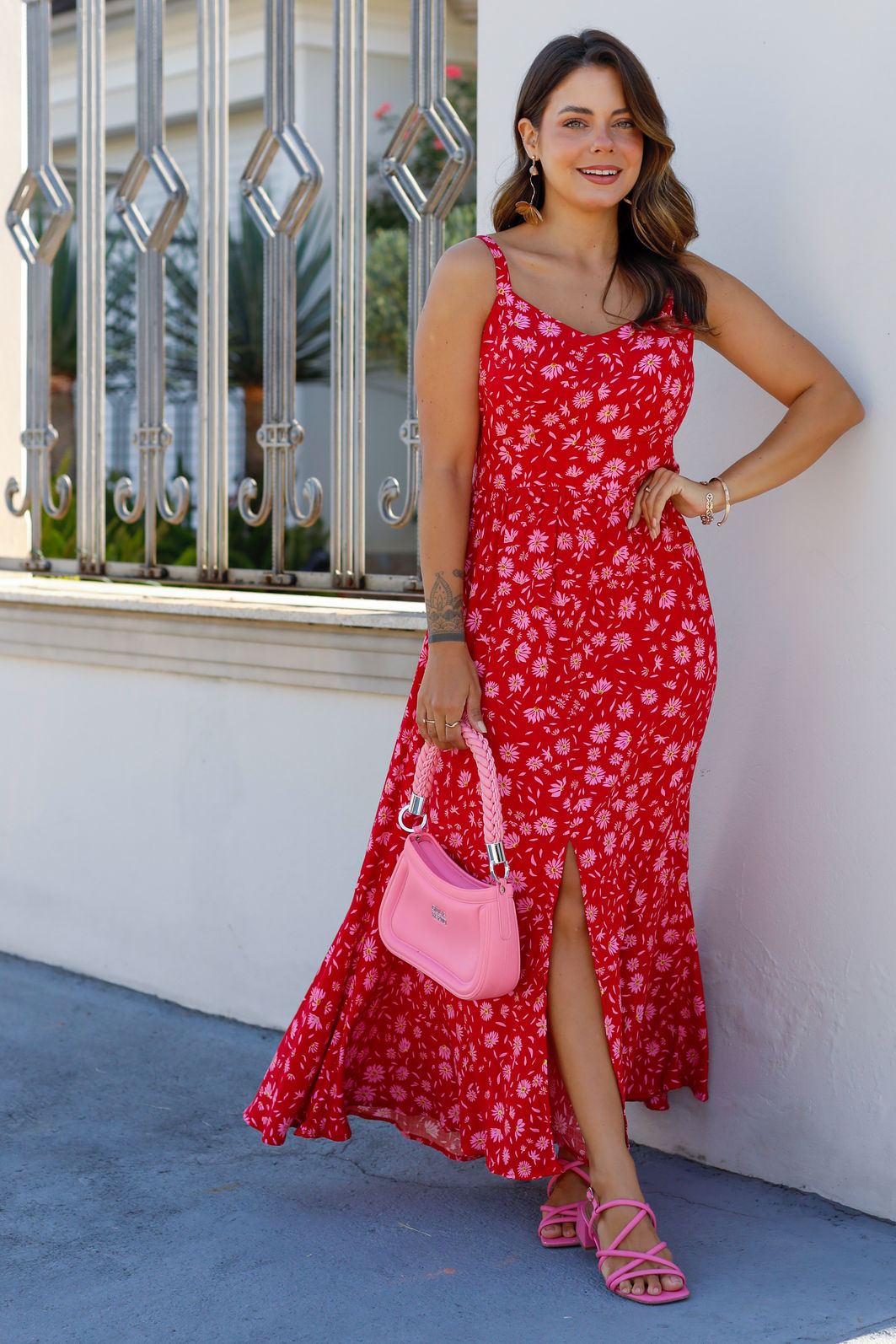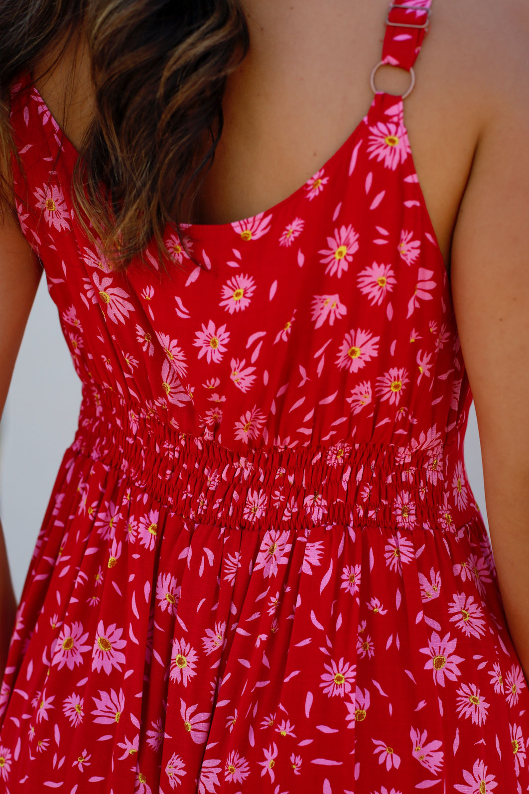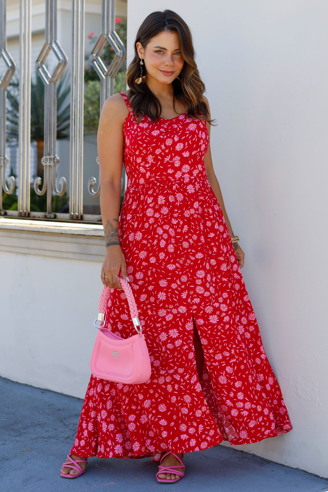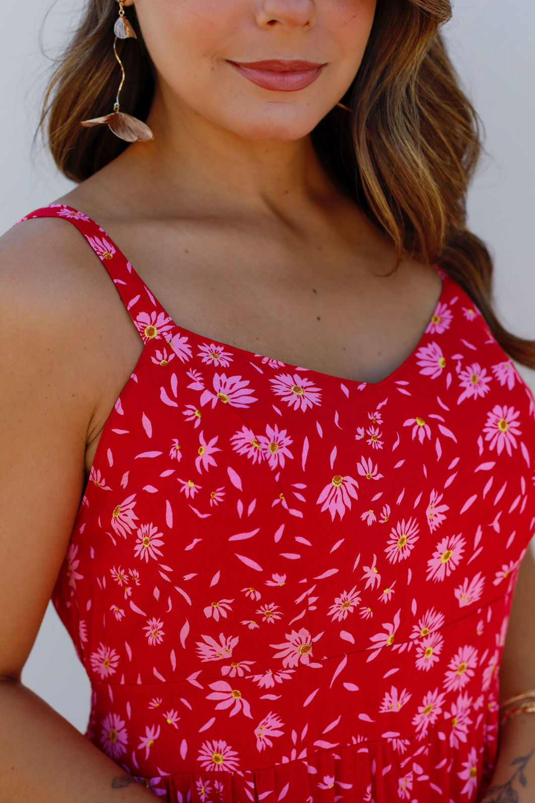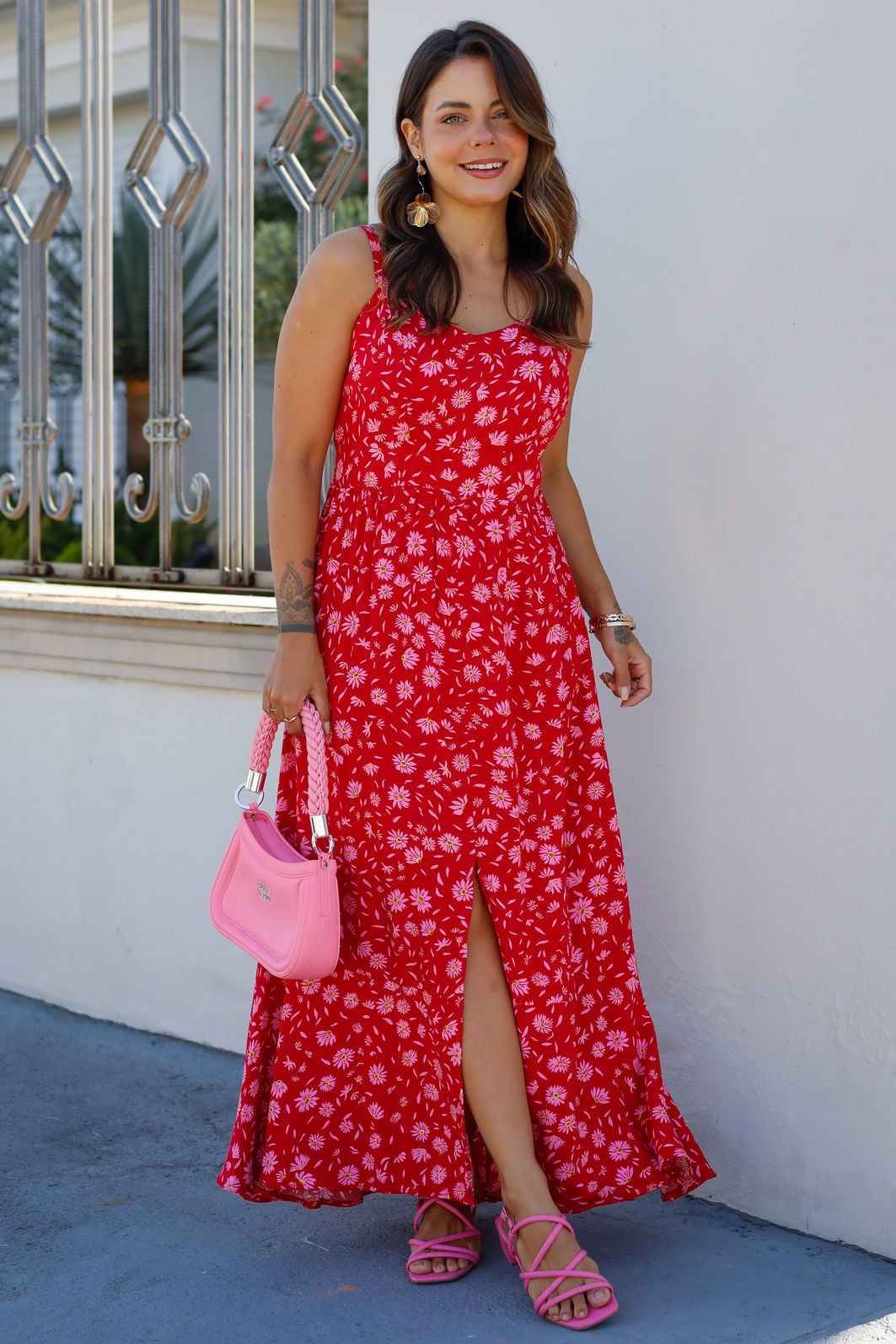 Estampa de Margaridas com Fundo vermelho rosado: A estampa de margaridas com fundo em tom vermelho rosado traz um ar tropical e vibrante, ideal para looks leves e marcantes.