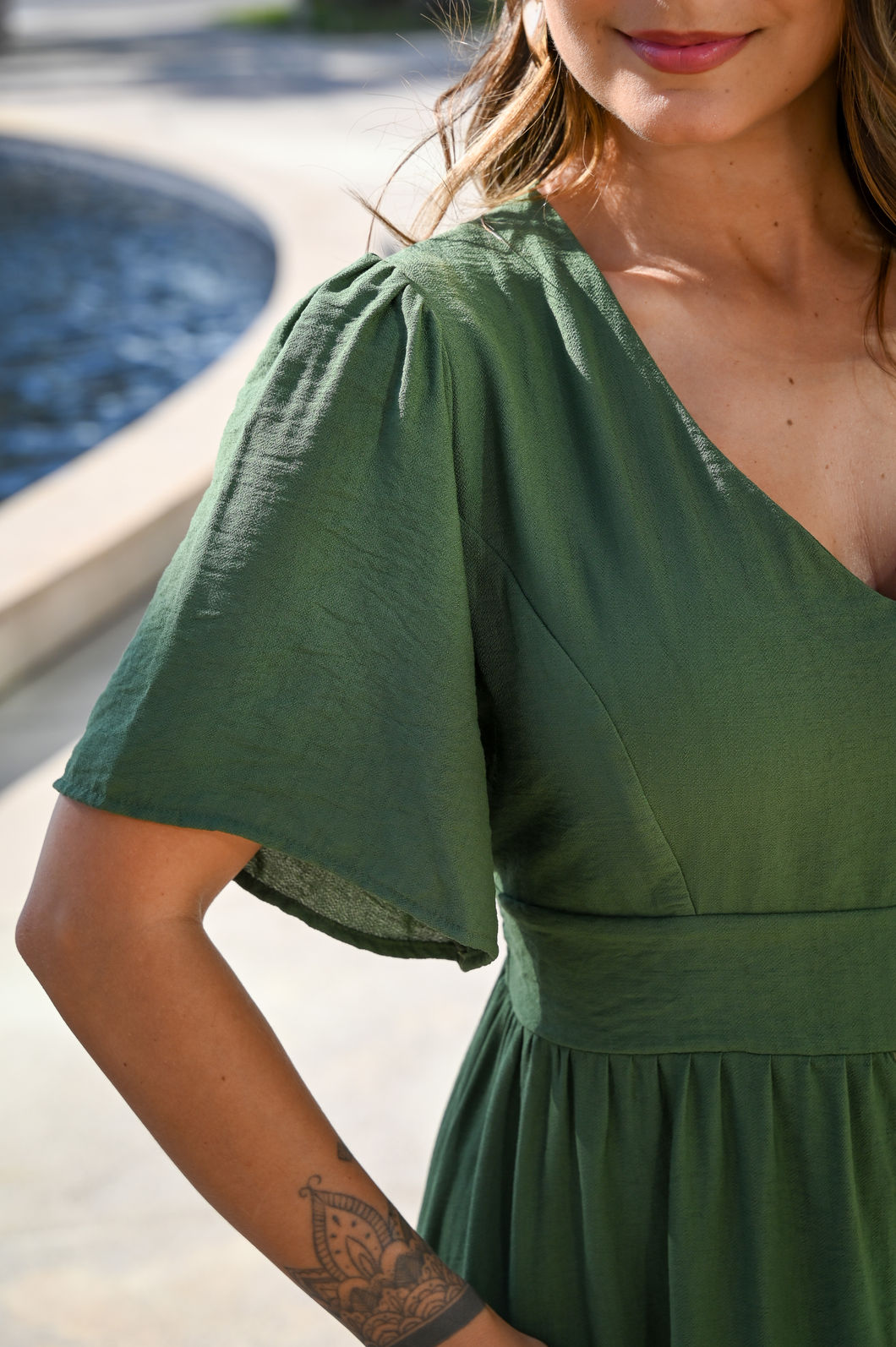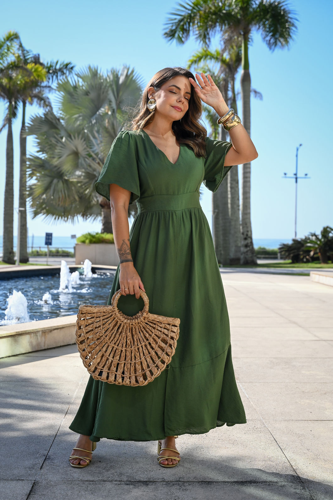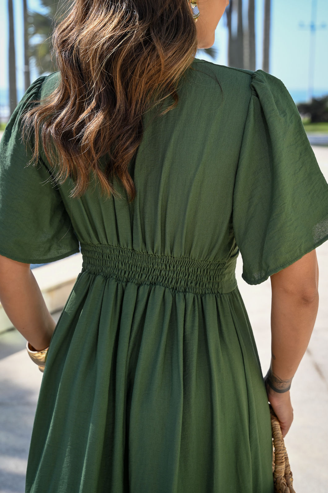 Na cor verde neutro, uma cor discreta, versátil e elegante, ele é perfeito para compor visuais refinados para diferentes ocasiões. Suas mangas fluidas conferem delicadeza, enquanto o busto duplo oferece segurança e sustentação. O detalhe sob o busto valoriza a silhueta de forma sutil. Com um ajuste impecável graças ao lastéx nas costas, o vestido ainda conta com uma abertura frontal e um babado em godê, que confere um movimento suave e gracioso à peça.