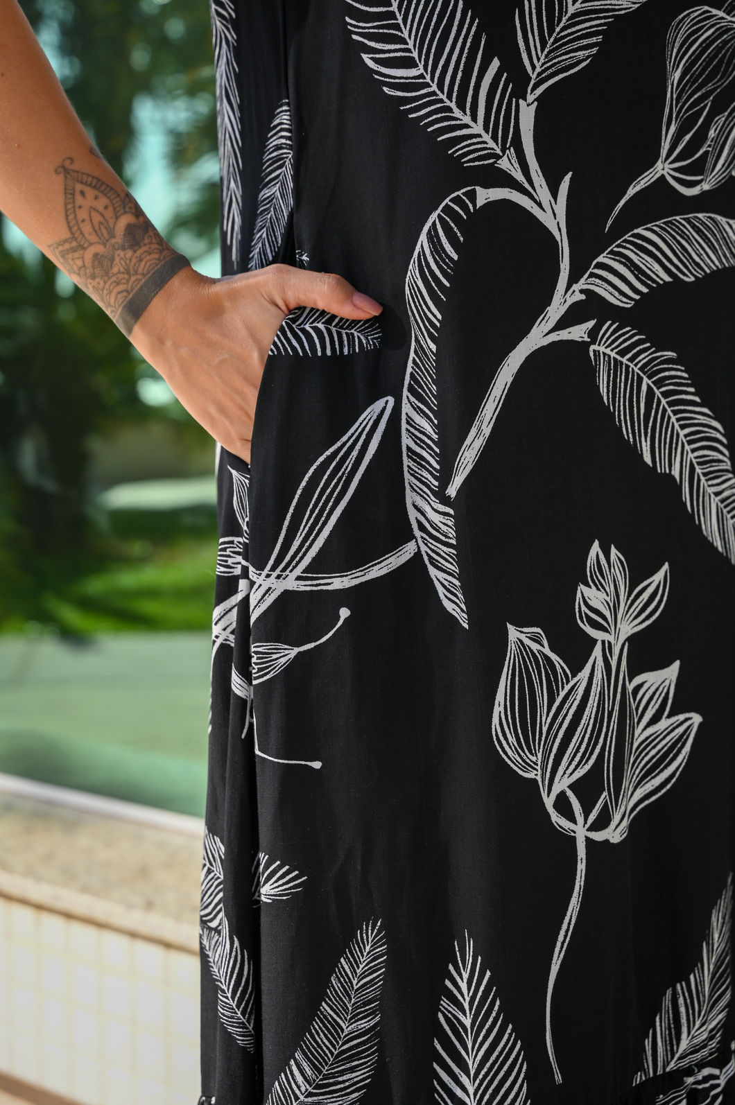 O vestido Talita é a escolha perfeita para quem busca elegância e praticidade no mesmo look. Feito em tecido leve de viscose, ele traz uma linda estampa de folhas em preto e branco, combinando um visual moderno e atemporal.