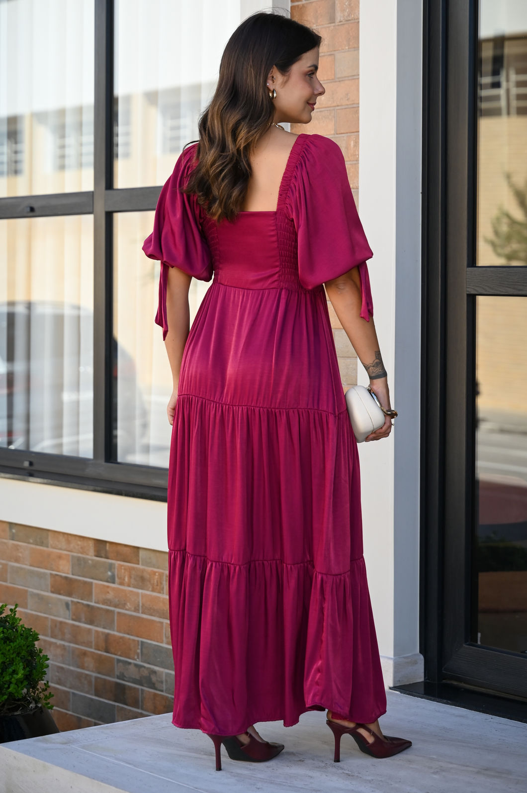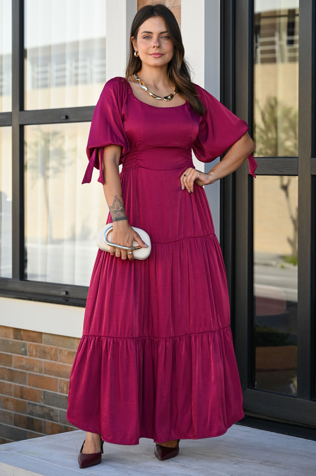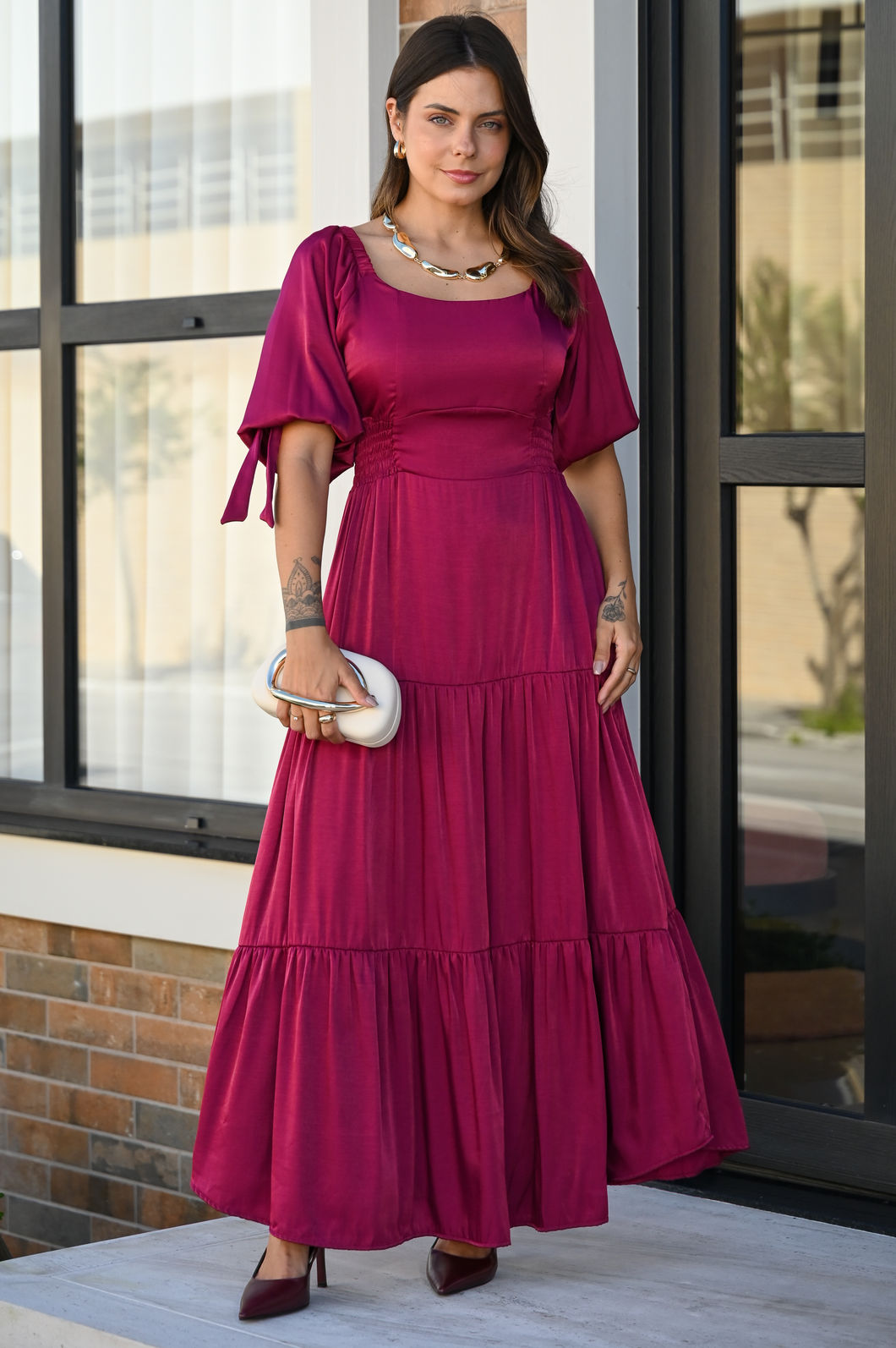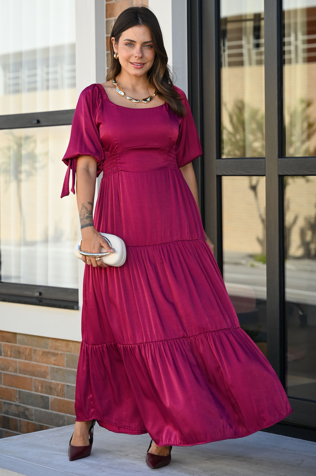 Esse vestido é a combinação perfeita de estilo e sofisticação! Confeccionado em tecido acetinado de alta qualidade, ele possui um elegante brilho que adiciona charme e requinte à peça. A cor Burgundy traz um toque feminino, ideal para ocasiões ESPECIAIS.